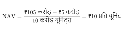 💡 उदाहरण: मान लीजिए कि एक फंड की कुल संपत्ति ₹105 करोड़ है, कुल देनदारियाँ (खर्च) ₹5 करोड़ हैं, और उसने निवेशकों को कुल 10 करोड़ यूनिट्स जारी की हैं।